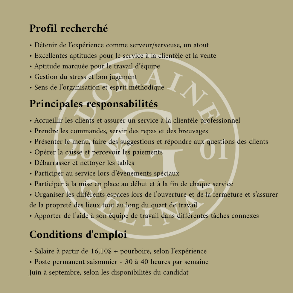 Envoyez-nous votre CV par courriel à info@domainegelinas.com afin que nous puissions faire connaissance! Au plaisir,